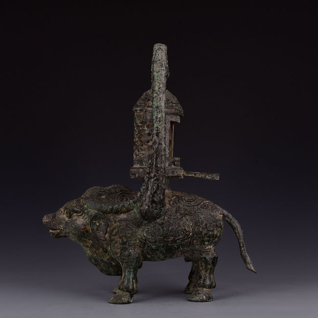 湖南省博物館的西漢牛形燈,燈為牛形,兩角沿背的兩側(cè)以圓管狀向上豎立,并會(huì)合為一,向下擴(kuò)大為覆碗狀,作為出煙管。牛腹中空可盛水,點(diǎn)燃時(shí)煙可通過(guò)腹中,以保持室內(nèi)空氣清潔,側(cè)有銘文十字,為當(dāng)時(shí)長(zhǎng)沙王劉發(fā)或其后代宗廟用器。